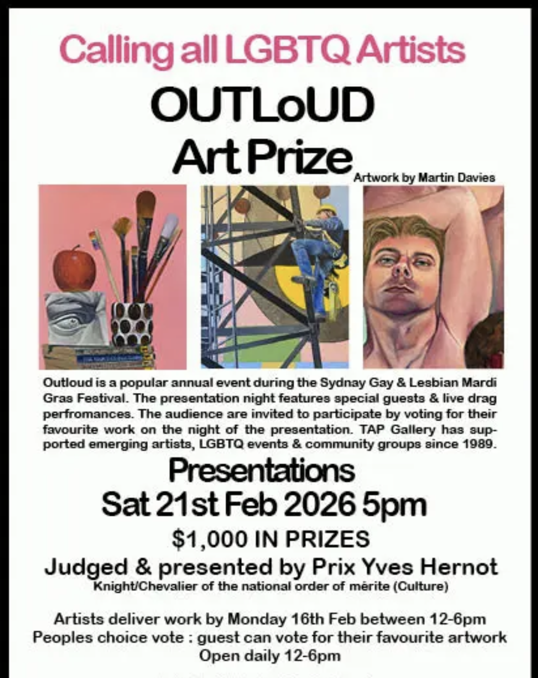 QUEER CONTEMPORARY “I DIDNT EXPECT TO LIVE THIS LONG” NATIONAL ART SCHOOL 12 FEB-8 MARCH OUT LOUD ART PRIZE AT TAP GALLERY CRYSTAL TITS: A DRAG FREAK SHOW GROVE BAR WEEKENDS IN FEBRUARY DARLINGHURST LIFE DRAWING: EACH SATURDAY IN FEBRUARY ESCANDOLO AT KINSELAS 8PM-3AM FRIDAY 13 FEBRUARY ES & FLO AT THE OLD FITZ THEATRE QTOPIA QUEER FOOD - A TASTE OF PRIDE SATURDAY 14 FEBRUARY 10AM-12PM POSSESSION AT QTOPIA SUBSTATION SATURDAY 14 FEBRUARY 2-3PM DISCOVER OXFORD ST WALKING TOUR WITH WONDERMAMA STRIP THE LIFE FANTASTIC. QTOPIA SUBSTATION. TUESDAY 17 FEBRUARY 8.30-9.30 DRAG AROUND SATURDAY 14 FEBRUARY 1.30-7PM. 5 VENUES. 4 SHOWS. 1 WINNER CASSY JUDY:THE TRANSFORMATION. QTOPIA SYDNEY SUBSTATION. 6.30-7.30 TUESDAY 17 FEBRUARY EAGLE BAR SYDNEY AT BURDEKIN FEBRUARY 20 - 27 MARGI PARTY AT CHIN CHIN SYDNEY 21FEBRUARY - 1 MARCH KYLIE VS MADONNA. THE OXFORD HOTEL. SATURDAY 21 FEBRUARY 9PM WE ARE HERE - EXHIBITION AND CREATIVE WORKSHOP AT ACE HOTEL SYDNEY SATURDAY 21 FEB, 11AM-5PM DYKADELLIC DANCE PARTY AT KINSELAS 21 FEBRUARY KING FOR A DAY WORKSHOP QTOPIA SYDNEY LOADING DOCK THEATRE SATURDAY 21 FEBRUARY 1-4PM CHUNK DOES MARDI GRAS AT THE BURDEKIN. SATURDAY 21 FEB 9PM-3AM QUEER SYDNEY LOST SPACES LIVING STORIES AT NSW STATE LIBRARY MONDAY 23 FEBRUARY 6PM BRUTE CLUBE PRESENTS ROGUE XL AT UNIVERSAL SUPPER CLUB THURSDAY 26 FEBRUARY 8PM-4AM QUEER ART AFTER HOURS AT ART GALLERY OF NSW WEDNESDAY 25 FEBRUARY 5-10PM PISS BE WITH YOU AT QTOPIA SYDNEY MONDAY 23 FEBRUARY 7PM MEGA MALEBOX AT STONEWALL HOTEL WEDNESDAY 25 FEBRUARY 9PM-11.30PM DRAG FOR GOOD (TRIVIA) AT YMCA SONG KITCHEN FRIDAY 27 FEBRUARY 6PM-9PM BEEFCAKE THICK N JUICY OXFORD ART FACTORY SUNDAY 1 MARCH 4PM-12PM BRUTE CLUBE PRESENTS ROGUE XL AT UNIVERSAL SUPPER CLUB THURSDAY 26 FEBRUARY 8PM-4AM QUEER ART AFTER HOURS AT ART GALLERY OF NSW WEDNESDAY 25 FEBRUARY 5-10PM THICK N JUICY THE MAIN EVENT FRIDAY 27 FEB 10PM-5AM AURA NIGHTCLUB AND SAUNA MEGA MALEBOX AT STONEWALL HOTEL WEDNESDAY 25 FEBRUARY 9PM-11.30PM